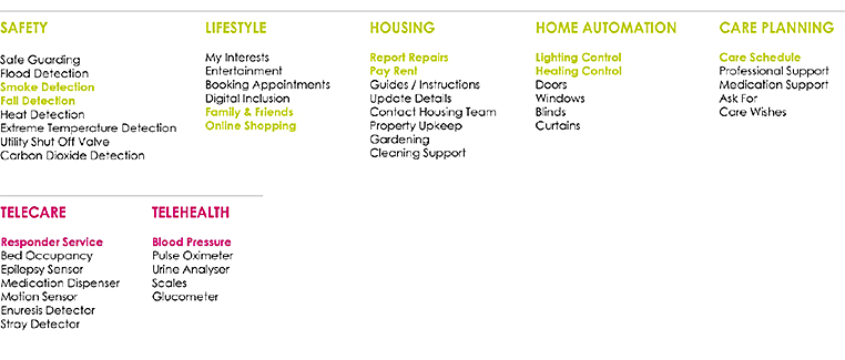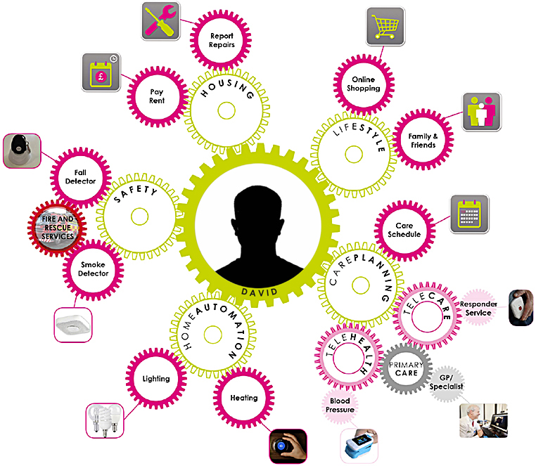 The system works across all aspects of an individual’s care, housing and support needs. Currently the system ‘cogs’ feature Care, Safety, Housing, Home Automation, Information, Digital Inclusion as well as Health & Wellbeing.