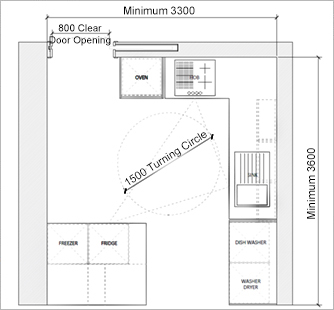 - 1500mm diameter turning circle or 1400mm x 1700mm elliptical activity space required in front of each work station and appliance