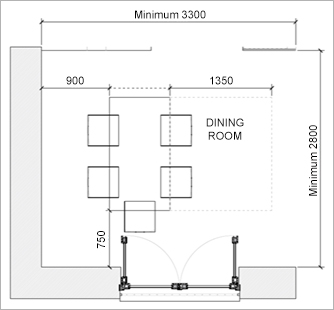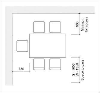 - Dining table activity space to achieve minimum 750mm at the head of the table, 900mm at any side adjacent to a wall and 1350mm at the side for wheelchair users to pass